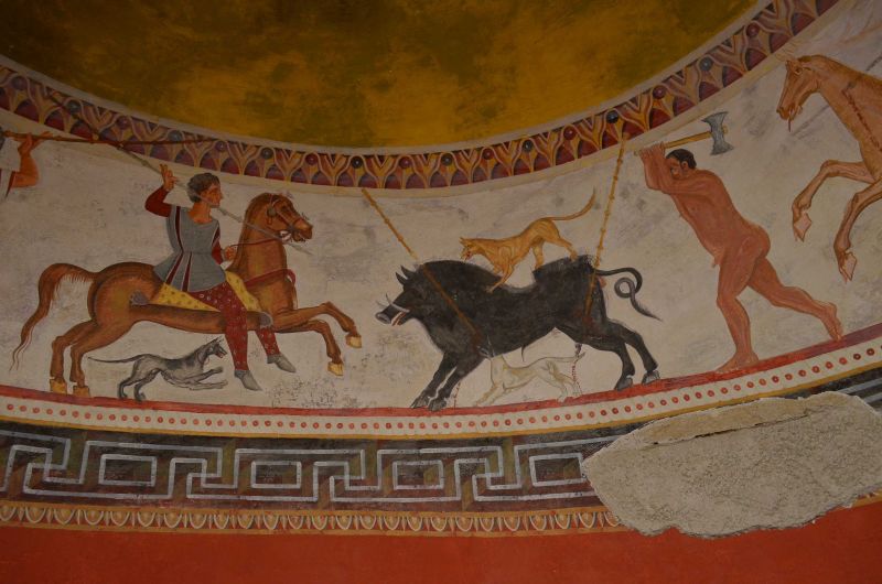 ... the best preserved figural frieze depicts scenes from the royal hunt. Hunting is one of the most popular topics in Thracian art. Scenes from it can be found on dozens of monuments, ornaments, vessels, votive tablets and others. In the minds of the ancient Thracians the order in the universe can be established by victory over the forces of chaos. Through beating boar - the embodiment of chaos, the ruler restored world order and acquire new, higher status….